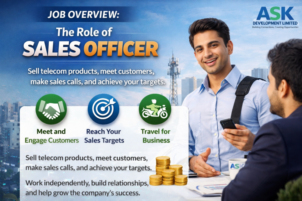 As a Sales Officer at ASK Development Limited, your main job will be to sell the company’s telecom products. You will travel, meet customers, make sales calls, and try to reach your sales targets. This job gives you both challenges and rewards, and it’s perfect for someone who enjoys working with customers and is goal-driven.