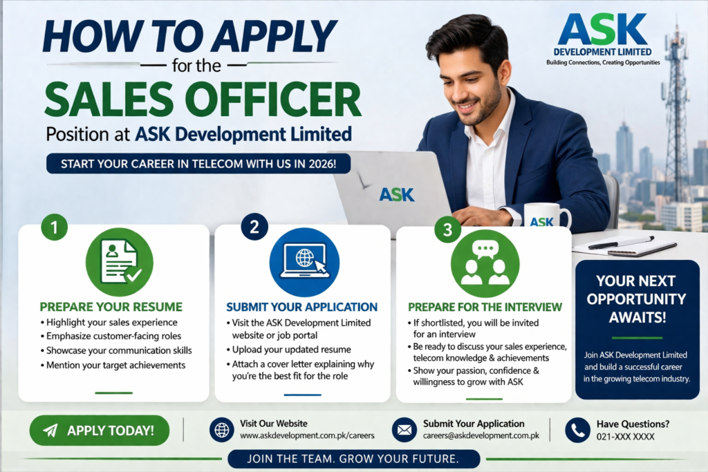 The telecom industry is changing fast, and joining ASK Development Limited in 2026 is a great opportunity. As a Sales Officer, you will be working with new products and services that are shaping the future of telecom.